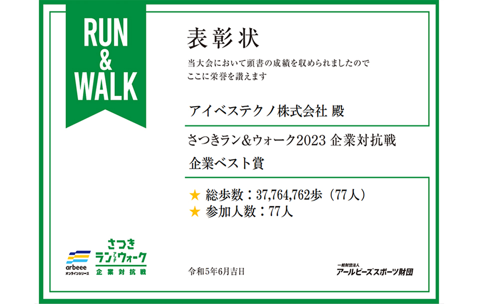 過去の総歩数・距離、もしくは過去の参加最高人数を更新した企業を表彰対象とする『企業ベスト賞』に入賞しました!